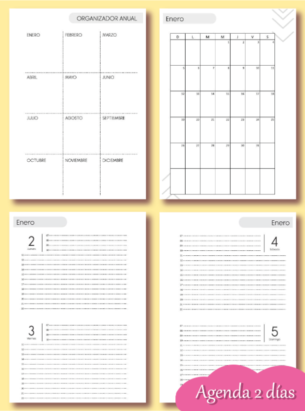 •Las agendas son A5 y pueden ser semanales, 2 días por página o diarias (van de menor a mayor cantidad de hojas) y te dejamos capturas de cómo son.
